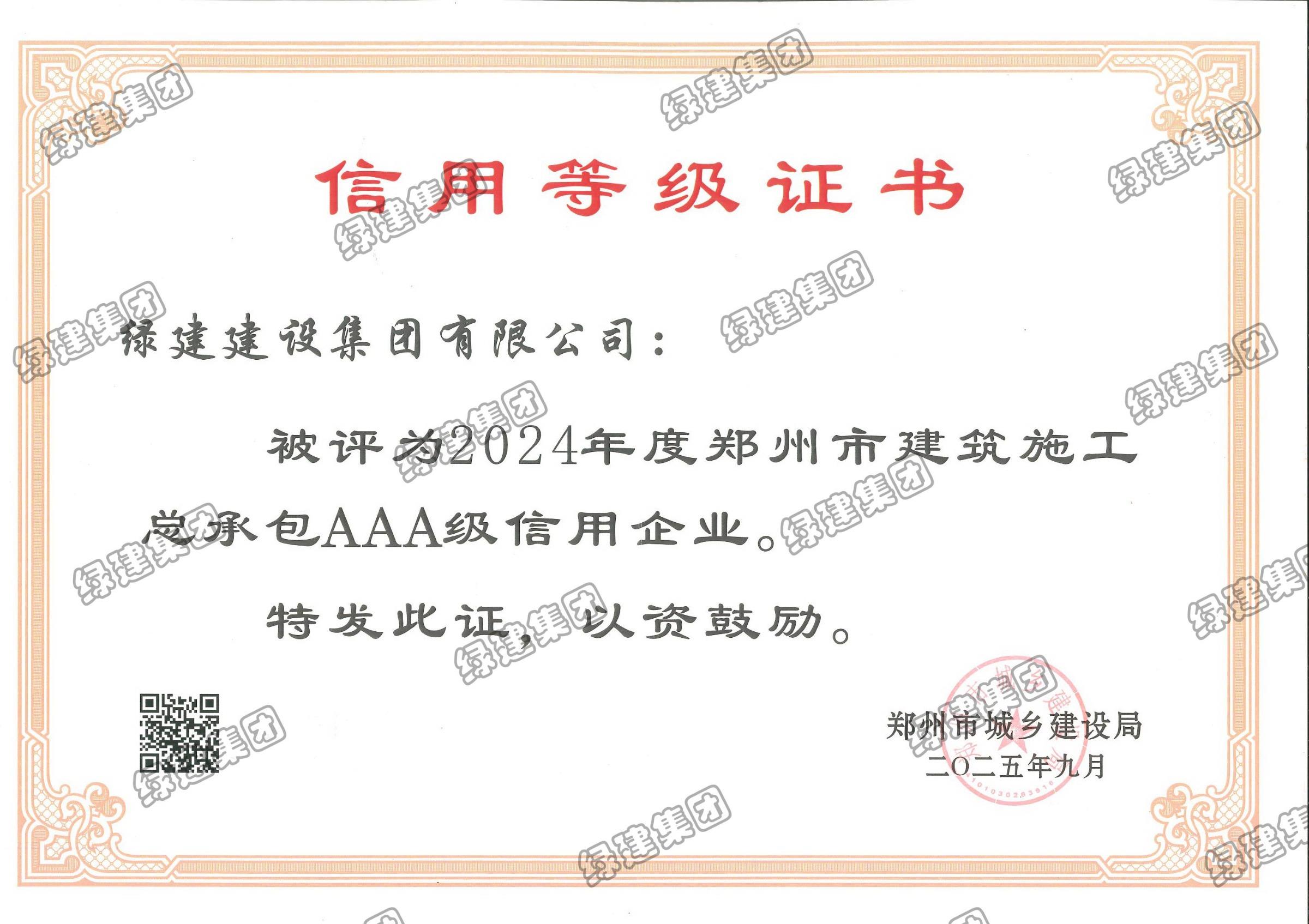 2024年度鄭州市建筑施工總承包AAA級信用企業